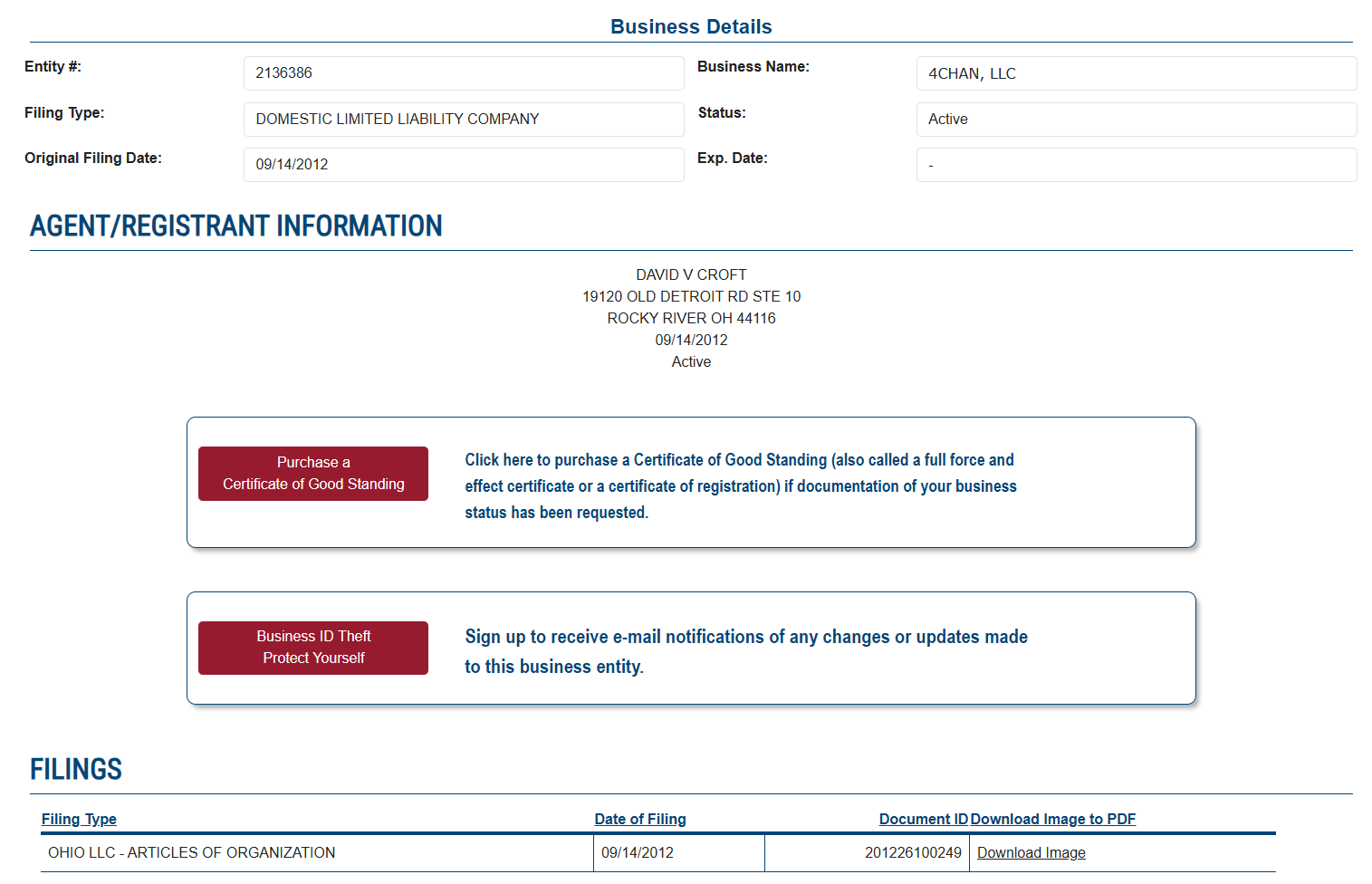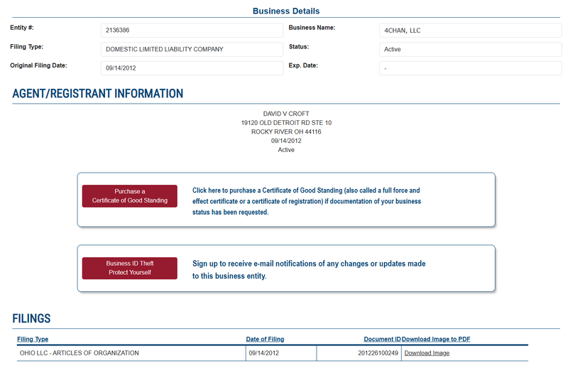 State of Ohio's Secretary of State's registry page for 4chan, LLC.